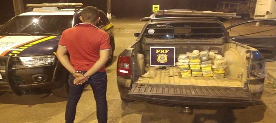 Um rapaz de 23 anos foi preso em flagrante com cerca de 35 quilos de cocaína escondidos na lataria da caminhonete. O flagra ocorreu durante uma abordagem de rotina da Polícia Rodoviária Federal do Acre (PRF-AC), no km 97 da BR-317, município de Senador Guiomard, interior do Acre, na noite desta quarta-feira (11).