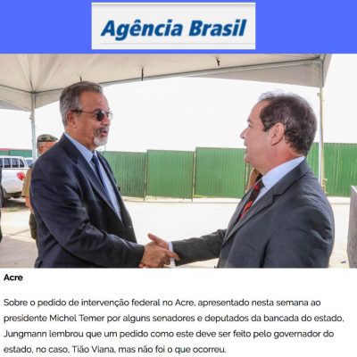 A matéria traz a explicação de que o grupo de parlamentares fez um pedido que não lhes cabe. “Sobre o pedido de intervenção federal no Acre, apresentado nesta semana ao presidente Michel Temer por alguns senadores e deputados da bancada do estado, Jungmann lembrou que um pedido como este deve ser feito pelo governador do estado, no caso, Tião Viana, mas não foi o que ocorreu.”