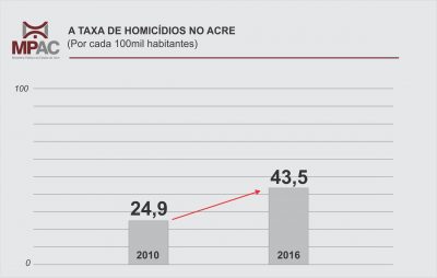 Em 2010, a taxa de homicídios no Acre era de 24.9 por 100 mil habitantes, passando para 43,5 seis anos depois. De 2015 para 2016, o número de assassinatos cresceu 83%. Em 2017, 42 pessoas foram assassinadas, em média, por mês no estado.