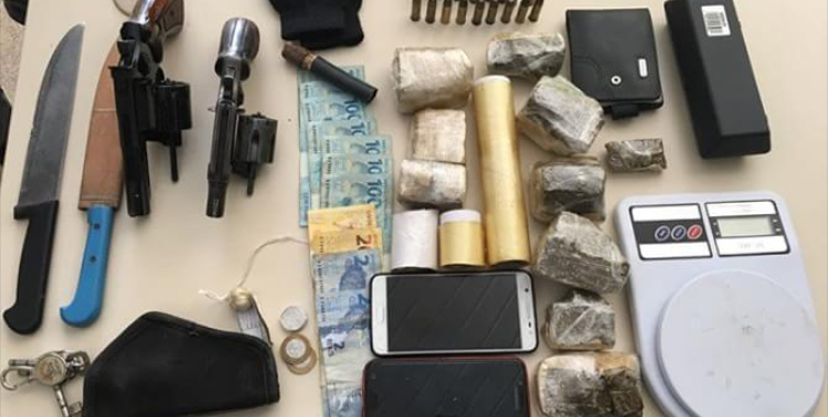 Forças de segurança do Estado deram cumprimento a dois mandados de prisão na manhã desta quinta-feira, 5, e prenderam, em flagrante delito, José Vanderlei Souza Aguiar, 30, vulgo “Bacana” e Gilvane Silva Ribeiro, 27. Em posse deles, foram apreendidas duas armas de fogo, “revolveres 38’” municiados, 1 ½ de droga (maconha), balança de precisão e material para embalagem do entorpecente.