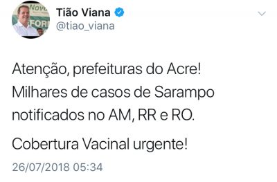 Diante deste cenário, o governador do estado, Tão Viana, fez um alerta na manhã desta quinta-feira (26) às prefeituras, para fazer a cobertura vacinal, evitando assim, surtos da doença no Acre. “Atenção, prefeituras do Acre! Milhares de casos de Sarampo notificados no AM, RR e RO. Cobertura Vacinal urgente!”, alertou o Governador