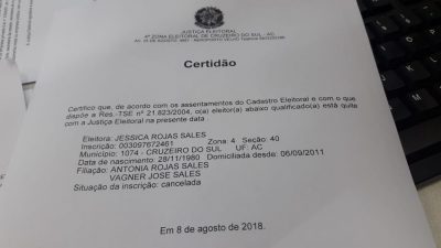 Apesar dos vários  meses de recadastramento biométrico na cidade cerca de 11 mil pessoas ficaram com problemas com a Justiça Eleitoral em Cruzeiro do Sul, esses títulos foram cancelados na cidade. A Deputada Jéssica Sales foi uma dessas pessoas.