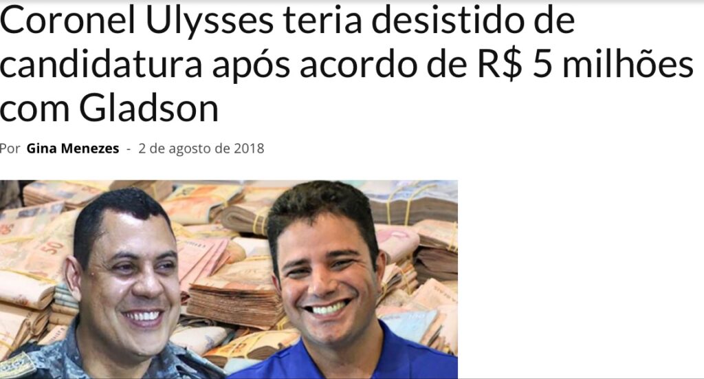 “Quanto à retirada da candidatura de Ulysses a decisão, segundo uma fonte de dentro da oposição que não será revelada, teria acontecido após um acordo no valor de R$ 5 milhões de reais.” Foi o que afirmou a colunista Gina Menezes.