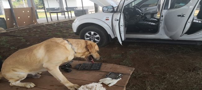 Informações davam conta que uma caminhonete com placa de Natal, Rio Grande do Norte, estaria trazendo armamentos em seu interior. A equipe conseguiu localizar o veículo e em uma busca com o auxílio dos cães farejadores do Batalhão de Operações Especiais (BOPE) conseguiram encontrar dois revólveres calibre 38.