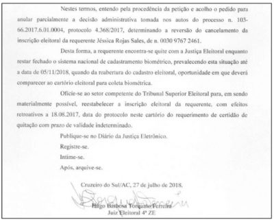 Contudo, o erro já foi reparado pela própria justiça de Cruzeiro do Sul. Por meio de uma ação judicial específica o Ministério Público Eleitoral e a Justiça Eleitoral reconheceram, respectivamente, o equívoco, determinando a reversão do cancelamento da inscrição eleitoral da Sra. Jéssica Sales. Segue, abaixo, o trecho da decisão judicial tomada nos autos do Processo n. 149-21.2018.6.01.0004 – classe petição, que contou com parecer favorável do Ministério Público: