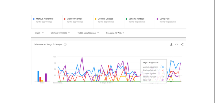 O melhor período para Marcus Alexandre ocorreu entre os dias 29 de julho e 4 de agosto. A análise do Google Trends também revela dados demográficos relevantes a respeito do interesse gerado pelos candidatos em diferentes regiões: o nome de Marcus Alexandre é referenciado em Goiás, São Paulo e Rondônia, por exemplo. Não há referências para os demais candidatos.