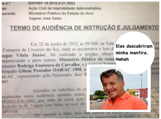 Após Leandro Altheman, jornalista do Juruá em Tempo, desarticular e levar a público intenção do ex-prefeito de Cruzeiro do Sul, Vagner Sales de enganar a Justiça, para não perder o costume, baixou o nível na tentativa de desviar o foco de seus atos de corrupção e usou o site Contilnet para, mais uma vez, mentir para população.