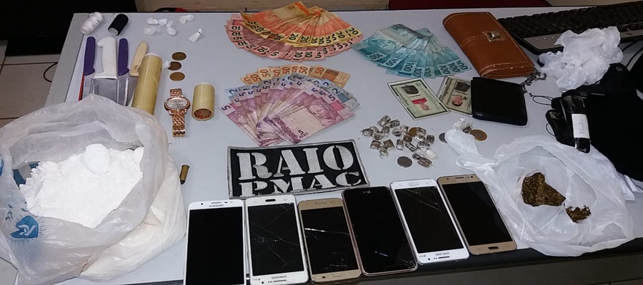 Foram encontrados 22 papelotes da droga e mais uma porção grande em uma sacola plástica, além de oito toucas de cloridato de cocaína, quatro facas, uma serra, seis celulares, um relógio e uma televisão. Em vários locais da residência havia cédulas e moedas de dinheiro, que contabilizou o total de 2.869,75 reais.