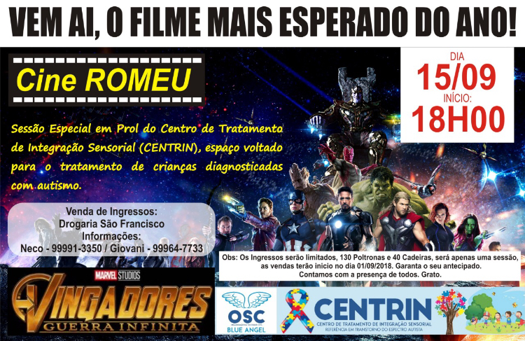 O CENTRIN – Centro de Tratamento de Integração Sensorial e Referência em Transtorno do Espectro Autista é uma unidade filantrópica, mantida por doações e com a poio da prefeitura de Cruzeiro do Sul. A unidade atende crianças com autismo e a demanda só cresce. Tendo em vista as dificuldades para manter o local funcionando com qualidade, o pai de uma das crianças, Giovani Lima, o médico do centro, Mazinho Maciel e o dono do único cinema da cidade, Neco Oliveira juntaram-se para oferecer uma sessão especial de Os Vingadores nesse Sábado (15) as 18h.