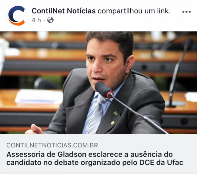 O senador Gladson Cameli bem que tentou justificar sua ausência no debate dos candidatos a governador do Acre promovido pela Ufac mas a emenda ficou muito pior que o soneto. Após publicar nota explicando os motivos do não comparecimento, Gladson passou a ser duramente atacado pelos internautas: “equívoco da assessoria do candidato. Ele deveria participar. Participando perde menos votos que não participando”, disse o funcionário público Jair Amorim. “Tem outra justificativa não: arregou como sempre”, completou a também servidora pública Yonara Cordeiro.