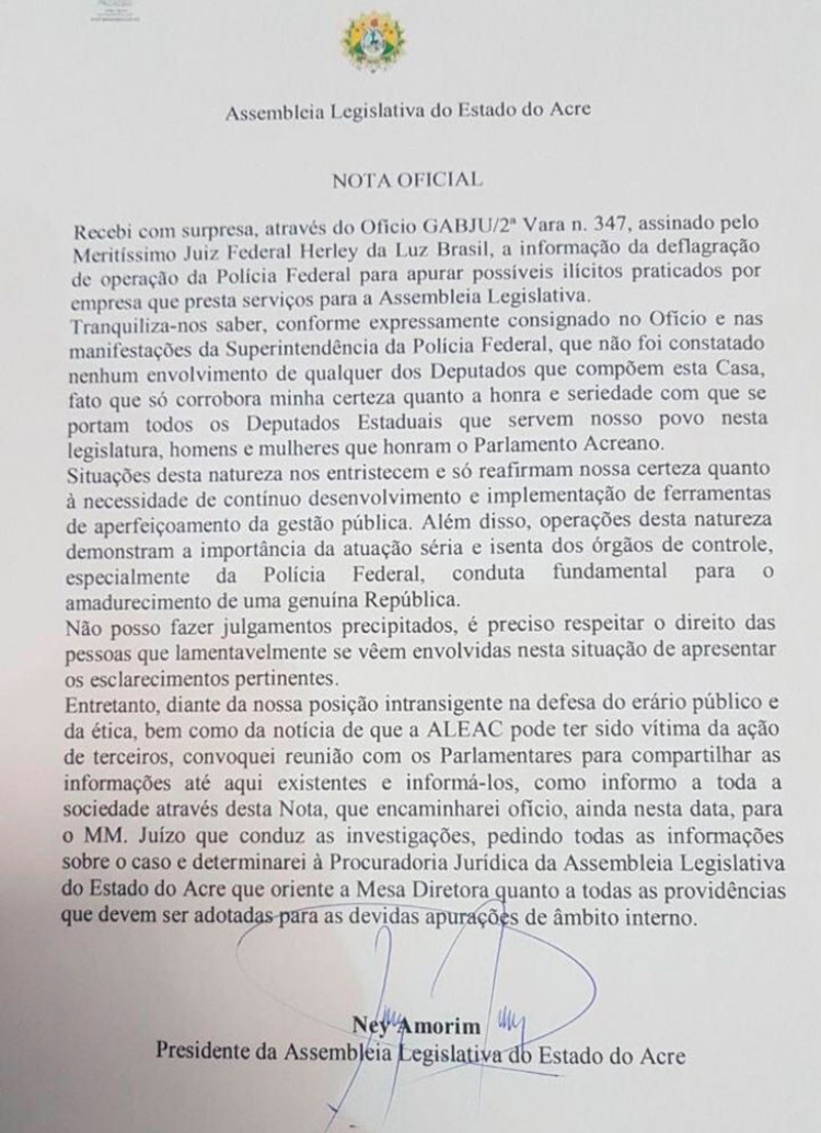 Em nota divulgada na tarde desta quinta-feira, 13, o deputado Ney Amorim, presidente da Mesa Diretora da Assembleia Legislativa do Estado do Acre, afirmou que foi comunicado, por meio de ofício da Justiça Federal, sobre o fato não existir nenhum parlamentar envolvido com supostos esquemas fraudulentos apurados na Operação Hefesto, da Polícia Federal.