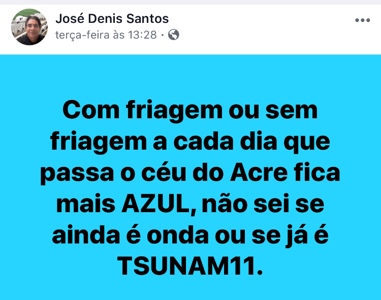 Sem temer que a baixa reputação vá para o ralo, Denis usa seus perfis para militar em favor de Gladson Cameli: “com friagem ou sem friagem a cada dia que passa o céu do Acre fica mais azul, não sei se ainda é onda ou se já é Tsunam11”, postou ele no dia 11 de setembro.