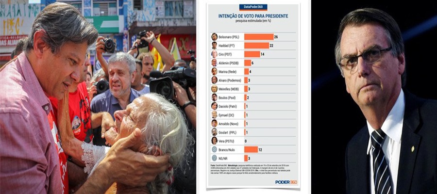 Pesquisa do instituto DataPoder360 apresenta o candidato do PT a presidente, Fernando Haddad, em um quadro de empate técnico com o candidato da extrema-direita, Jair Bolsonaro (PSL); segundo a pesquisa, Bolsonaro aparece com 26%, seguido de Haddad com 22%. Ciro Gomes (PDT) aparece em terceiro com 14%, Geraldo Alckmin (PSDB) com 6% e Marina Silva, com 4%; pesquisa DataPoder foi realizada por telefone, entre os dias 19 e 20 de setembro com 4.000 eleitores; margem de erro é de 2 pontos percentuais para mais ou para menos.