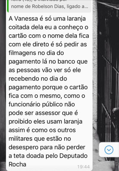 Postagens, áudios e imagens vazadas nas redes sociais mostram Rocha como um produtor de “laranjas”, como uma certa Vanessa, cujo cartão bancário, segundo as notas compartilhadas, “ficam na mão dele”. Há muito mais podres vindo à tona: um carro comprado com o dinheiro dos militares estaria sendo usado para fazer campanha para Gladson Cameli mas há temor em fazer as denúncias porque alguns dizem que não confiam na Justiça Eleitoral.
