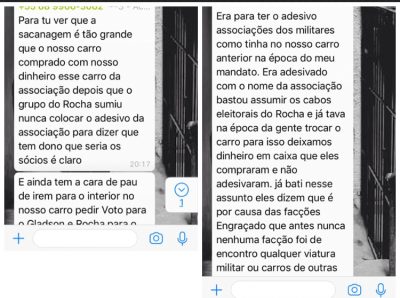 Os militares denunciam o loteamento que Rocha está promovendo no sonhado governo de Gladson Cameli. O oficial Joelson, da cúpula da AME, estaria pronto para ser o secretário de Segurança. A Tenente Candeias, que é candidata a deputada estadual, esbraveja para que os militares não se iludam porque o secretariado de Gladson será contra os anseios dos militares. Luiz Malheiros, conselheiro do Tribnunal de Contas do Estado, por exemplo, é apontado como o futuro secretário de Planejamento –mas ele seria muito avesso às aspirações militares. “Esses civil (sic) não gosta de policia”, diz Candeias.