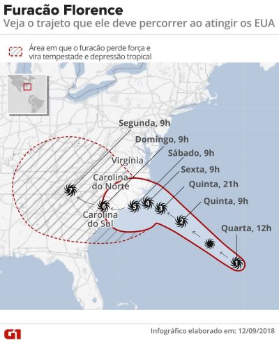Estima-se que o Florence será o pior furacão a atingir o país em décadas. Ele é classificado como um furacão de categoria 4, em uma escala que vai até 5.