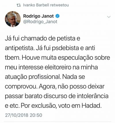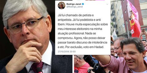“Já fui chamado de petista e antipetista. Já fui psdebista e anti tbem. Houve muita especulação sobre meu interesse eleitoreiro na minha atuação profissional. Nada se comprovou. Agora, não posso deixar passar barato discurso de intolerância e etc. Por exclusão, voto em Haddad”, disse o ex-procurador-geral da República, Rodrigo Janot, que esteve à frente da PGR durante a Lava Jato.
