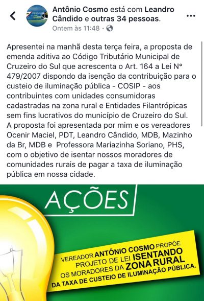 Lançando mão do velho ditado de que: “a população esquece rápido”, Cosmo agora tenta fazer aplicar o atestado de burro para população de Cruzeiro do Sul, reapresentando o mesmo projeto que ajudou a derrubar, propondo a isenção da taxa de energia para moradores da zona rural.