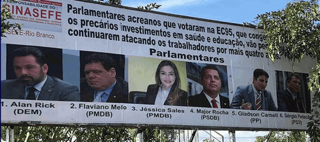A placa trazia os nomes e as rostos dos deputados federais Alan Rick (DEM), Jéssica Sales (MDB) e Flaviano Melo (MDB) e do senador Sérgio Petecão (PSD), que disputam reeleição no próximo domingo, 7. Também aparecem no outdoor os candidatos a governador e vice-governador do Acre Gladson Cameli (Progressistas) e Major Rocha (PSDB). Estes votaram pela EC 95 enquanto ocupavam mandato de senador e deputado federal, respectivamente.