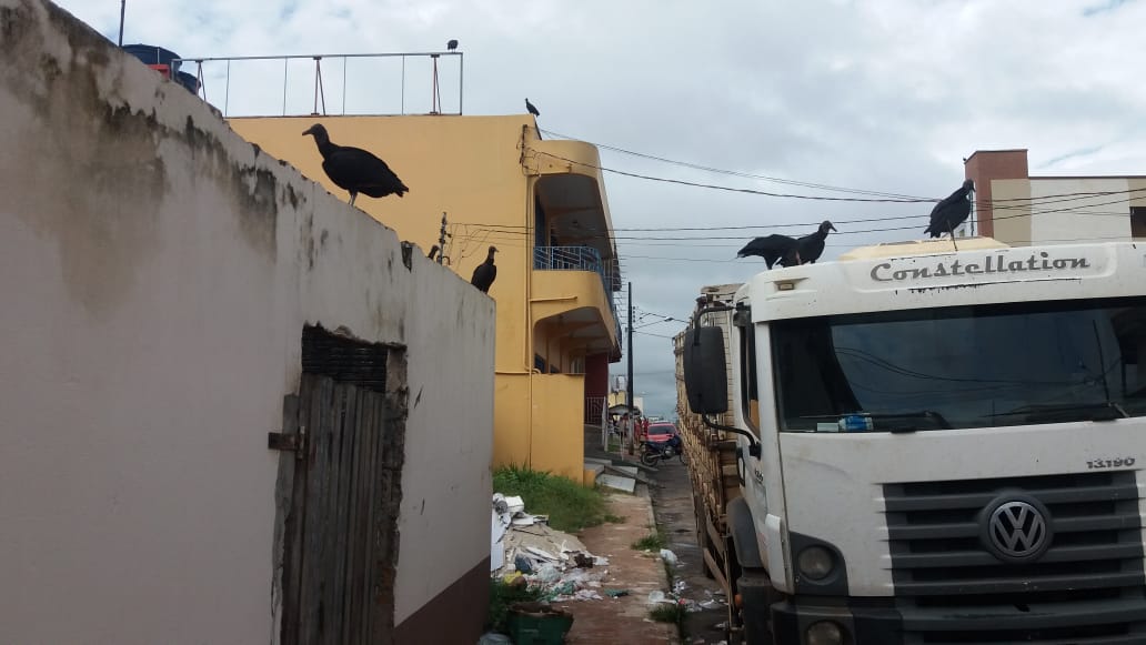 Caminhão estacionado com restos de animais atrai urubus e causa mau cheiro no Centro da cidade