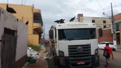Um caminhão que ficou estacionado no Centro da cidade de Cruzeiro do Sul durante todo o dia desta segunda-feira (5) e permanecia durante a manhã desta terça-feira (6), causou transtornos para comerciantes e empregados de loja que trabalham no local. Na carroceria do carro havia caixas d’água com restos que animais que atraíam cães e urubus e provocavam um cheiro insuportável.