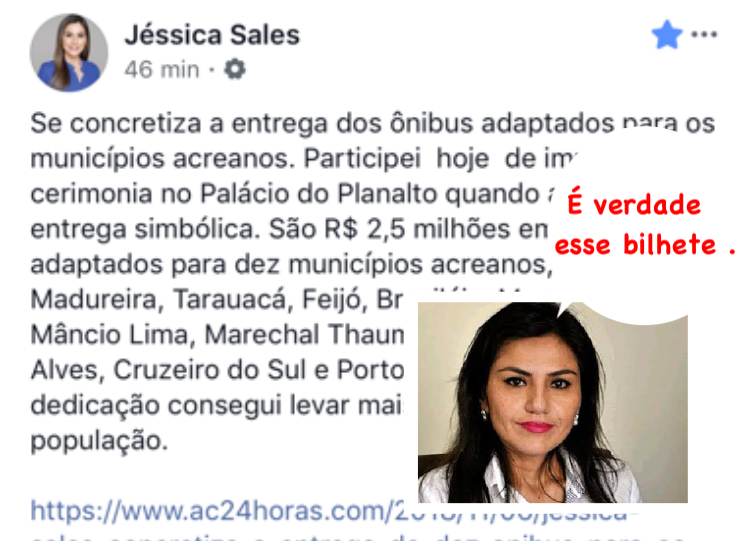 A deputada Jéssica Sales trombeja aos mundos mas a opinião pública está atenta com as notícias falsas que ela tenta criar. O caso mais recente diz respeito aos ônibus obtido pelo esforço da Prefeitura de Cruzeiro do Sul através da Secretaria de Assistência Social que se inscreveu no programa do Governo Federal. Jéssica tenta ganhar nome em cima dessa conquista, que é exclusiva do Município de Cruzeiro do Sul e seu representante, o prefeito Ilderlei Cordeiro.