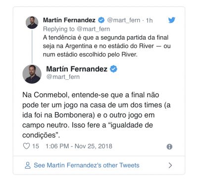 “Claramente estávamos em desvantagem esportiva ontem (sábado) e hoje (domingo). Não havia condições do Boca jogar, não estávamos nas mesmas condições do River”