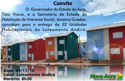 O governo do Estado, por meio da Secretaria de Habitação de Interesse Social (Sehab) e Secretaria de Obras Públicas (Seop) entregará nesta sexta-feira, 09, 52 residências no loteamento Andirá, em Rio Branco. O evento será realizado às 8:30h no loteamento.