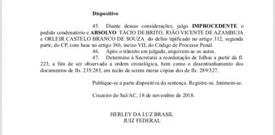 A Justiça Federal de Cruzeiro do Sul absolveu o ex-diretor dos Depatamentos Estadual de Águas e Saneamento do Acre (Deas), Tácio de Brito, pai do Deputado Federal, Léo de Brito (PT), das acusações de peculato durante a construção de sistemas de abastecimento de água e melhorias sanitárias na aldeia Nova Vida, em Marechal Thaumaturgo, onde vivem os índios ashaninka. “No caso presente, forçoso é reconhecer que não há, nos autos, elementos aptos a ensejarem a condenação dos réus”, disse o juiz Herley Brasil, da 1ª Vara da JF em Cruzeiro do Sul.
