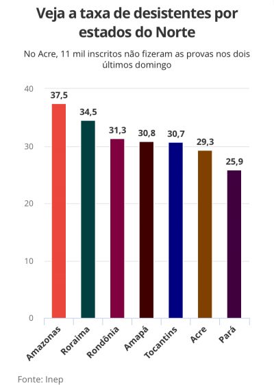 No Norte, o estado acreano teve a segunda menor taxa de desistentes, logo atrás do Pará, que teve 25,9%. O Amazonas lidera o ranking com 37,5%.