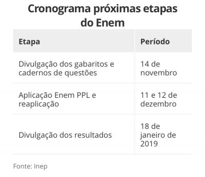 As próximas etapas agora são a divulgação de gabaritos e cadernos de questões, que ocorre já nesta quarta-feira (14). Aplicação Enem PL e reaplicação, marcadas para 11 e 12 de dezembro, e a divulgação dos resultados, deve ocorrer em 18 de janeiro.