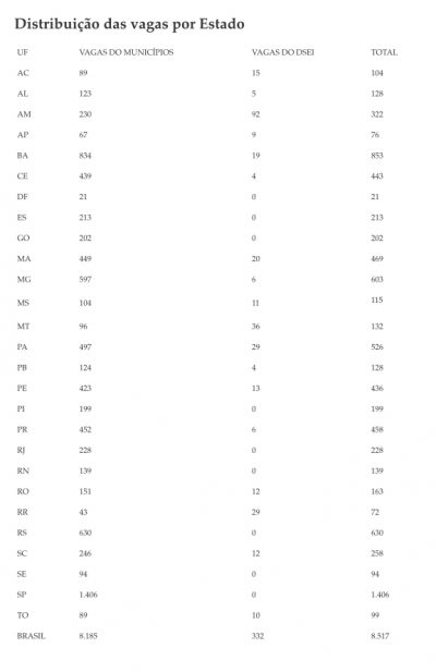 O novo edital do Programa Mais Médicos será publicado no Diário Oficial da União desta terça-feira (20/11). O anúncio foi feito nesta segunda-feira (19) pelo ministro Saúde, Gilberto Occhi. Serão ofertadas 8.517 vagas para atuação em 2.824 municípios e 34 Distritos Sanitários Especiais Indígenas (DSEI), que antes eram ocupadas por médicos da cooperação com Cuba.
