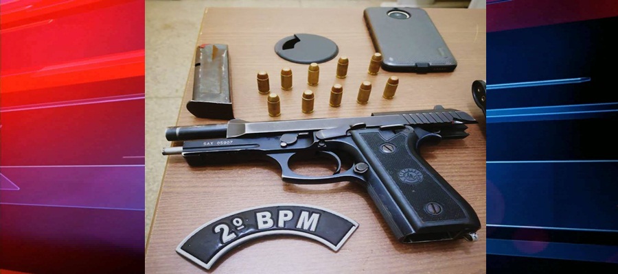 Guarnição realizava patrulhamento quando avistou o menor aparentando nervosismo ao ver a viatura policial. Em abordagem e busca pessoal, foi encontrada em sua cintura a pistola PT 100, de uso exclusivo das forças policiais.