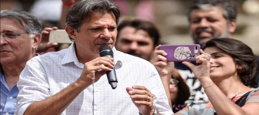 The presidential candidate of Brazil's Workers' Party (PT), Fernando Haddad (L), talks to supporters during a campaign rally in front of the Museum of Inconfidence in Ouro Preto, in state of Minas Gerais, Brazil, on September 21, 2018 ahead of the October 7 national election. Haddad was named as the PT candidate after Lula finally gave up his bid to stand in the October 7 first round presidential election from his prison cell. / AFP PHOTO / DOUGLAS MAGNO