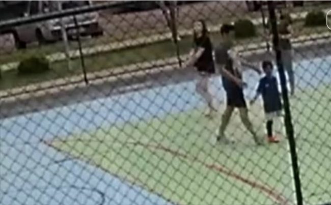 Outra câmera mostra o momento em que o pai carrega o filho no colo em direção à quadra