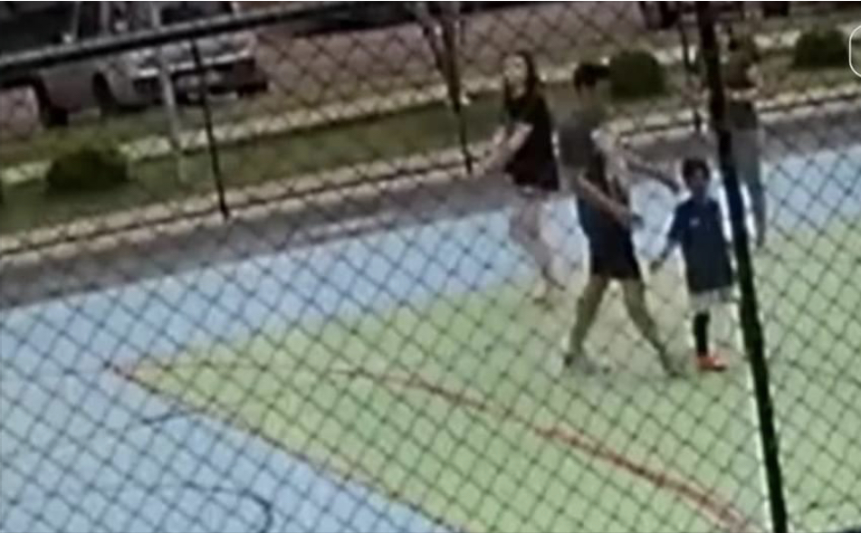 Uma outra câmera do condomínio mostra o momento em que o pai carrega o filho no colo em direção à quadra onde várias crianças brincavam.