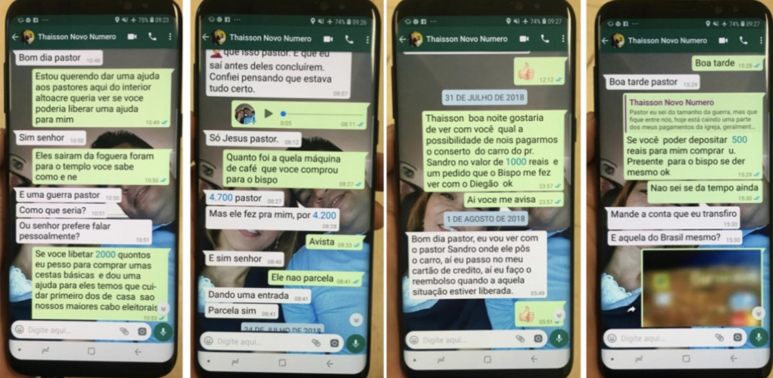 Em outro momento, o vereador solicita a quantia de R$ 1 mil para pagar o conserto do carro de um pastor. Outras diversas mensagens revelam a transferência e solicitação de pagamento entre os dois envolvidos.
