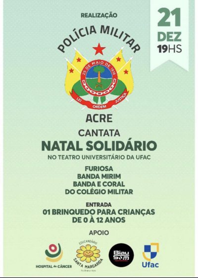 O comando da Polícia Militar do Acre (PMAC) realiza na próxima sexta-feira, 21, a Cantata Natal Solidário. O evento será a partir das 19 horas, no Teatro Universitário da Universidade Federal do Acre (Ufac).