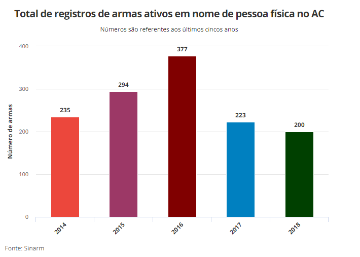 Proporcionalmente, o Acre é o estado com maior taxa de armamento, segundo apontou um levantamento da Folha de São Paulo em parceria com o Sistema Nacional de Armas (Sinarm), da Polícia Federal. De acordo com os dados, de 2014 a 2018, 4.933 pessoas tiraram registro para possuir uma arma.