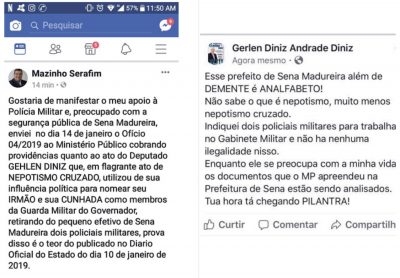 “Enviei no dia 14 de janeiro o ofício 04/2019 ao Ministério Público cobrando providências quanto ao ato do deputado Gerlen Diniz que, em flagrante ato de nepotismo cruzado, utilizou de uma influência política para nomear seu irmão e sua cunhada como membros da guarda militar do governador. Retirando o pequeno efetivo de Sena Madureira dois policiais militares”, disse Mazinho em seu post.