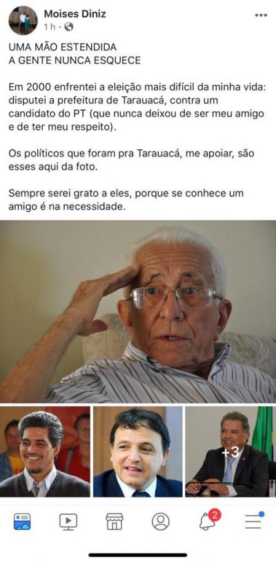 O ex-deputado estadual e federal, Moisés Diniz, usou sua rede social para relembrar as eleições de 2000, quando disputou a Prefeitura de Tarauacá com o candidato do PT, Jasone Ferreira da Silva.