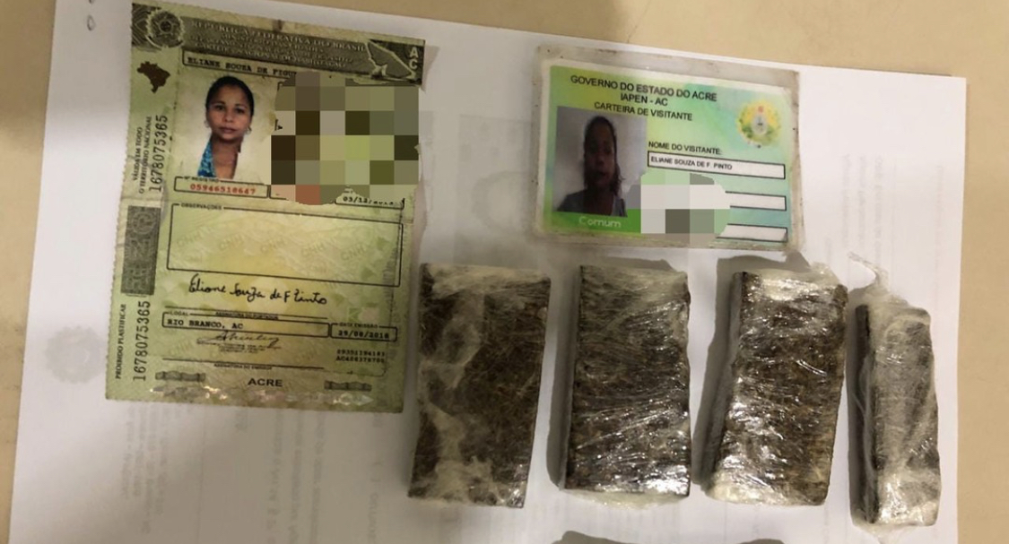 Uma mulher identificada como Eliane Souza de F. Pinto foi presa, na tarde de sábado (25), ao ser flagrada com cinco barras de maconha tentando no Complexo Prisional Francisco d’Oliveira Conde (FOC), em Rio Branco. A droga estava escondida nas partes íntimas.