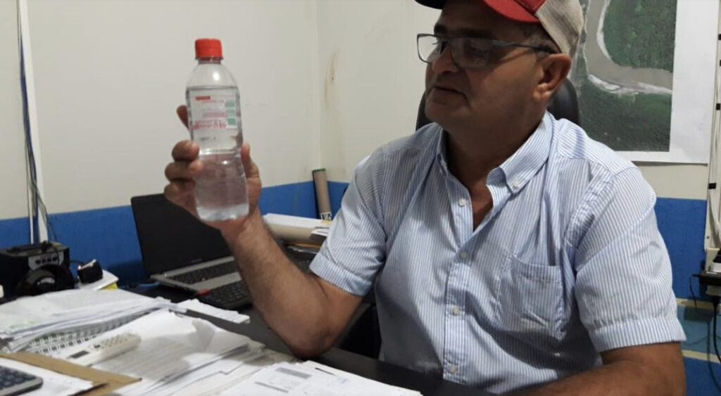 Prefeito Tanízio de Sá segura uma das garrafas que estava com água dentro do frigobar — Foto: Aldejane Pinto/Arquivo pessoal