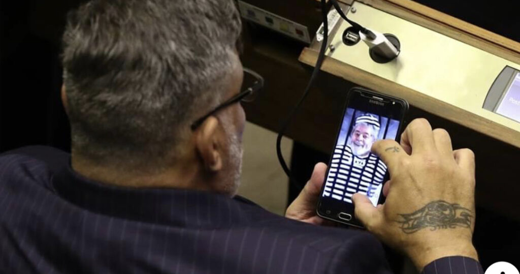 O ex-ator pornô, em seu primeiro dia como deputado federal eleito, foi flagrado sentado no plenário brincando de colocar roupa de presidiário em uma foto de Lula no celular. O registro foi do fotógrafo Lula Marques, o mesmo que flagrou Jair Bolsonaro dizendo que não quer buscar o filho na Papuda.