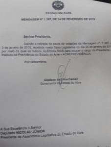 Nesta quinta-feira, 14, o governo do Estado pediu a Assembleia Legislativa que retire da pauta de apreciação, na Casa, o nome de Alércio Dias. O pedido do governo ocorre depois que o Ministério Público recomendou a Aleac que não aprecie o nome de Dias por considerá-lo com “inabilidade e ausência de competência para ser gestor público nos moldes do Acreprevidência”.