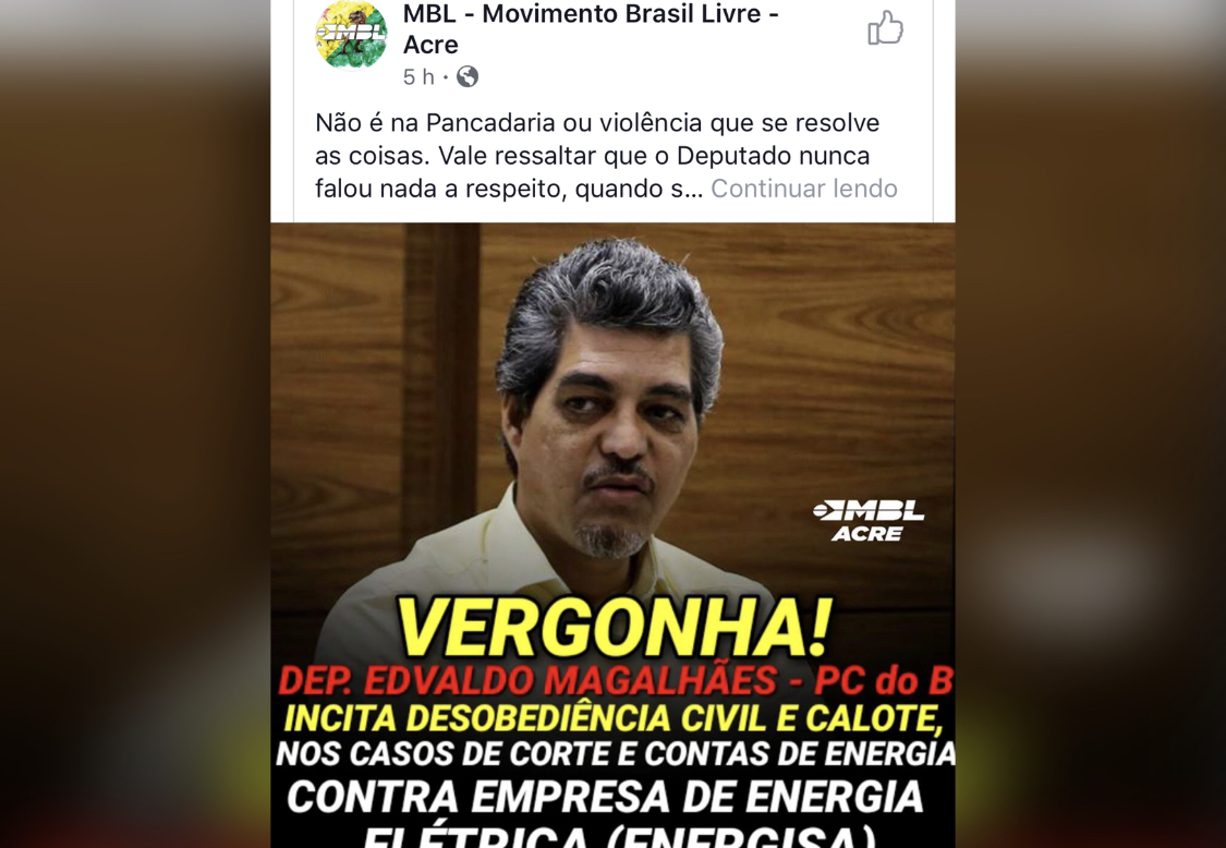 Após sugerir um boicote à Energisa, o deputado estadual Edvaldo Magalhães (PCdoB) foi alvo de críticas por parte do Movimento Brasil Livre (MBL), que afirmou que o parlamentar estaria incitando desobediência civil e calote.