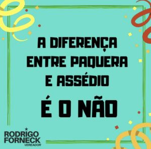 O vereador observa ainda que “mulheres não são corpos” e que têm direito de ir e vir como qualquer homem. “O fato de elas estarem se divertindo no Carnaval, não nos dá o direito de achar que temos alguma autoridade sobre elas”, frisou.