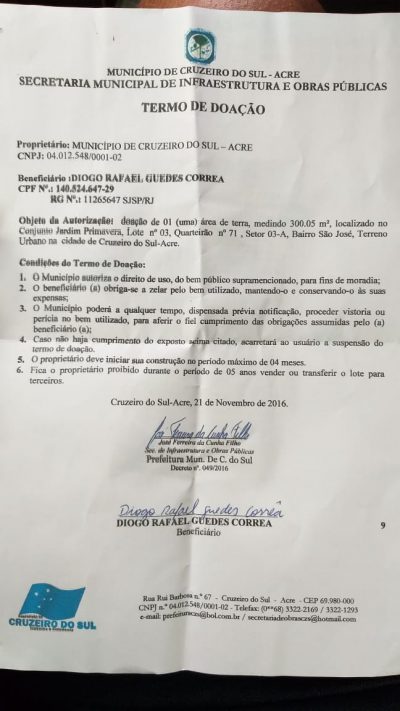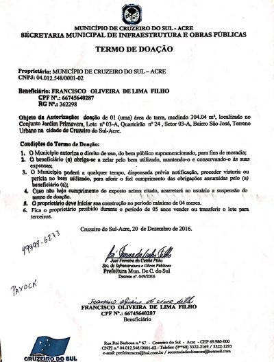 Segundo informações obtidas pelo jornal ‘O Juruá em Tempo’, foram pelo menos três terrenos doados para aliados do ex-prefeito, incluindo o ex-secretário municipal José Maria de Lisboa. Os outros beneficiários seriam Rafael Karioka e o feirante Francisco de Oliveira de Lima, mais conhecido como Paxoca.