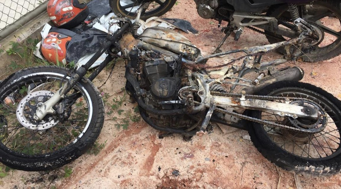 Os bandidos usaram uma ferramenta para cortar a corrente que fechava a porta da garagem com um cadeado. Depois de roubar a moto, os bandidos levaram para uma distância de menos de 500 metros da casa e atearam fogo.