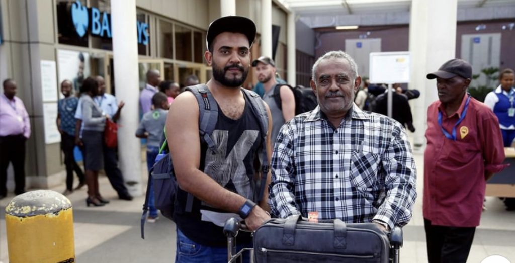 O passageiro Ahmed Khalid, que perdeu o voo da Ethiopian Airlines que caiu neste domingo (10) com 157 pessoas a bordo, foi recebido pelo pai, Khalid Bzambur, após pegar outro avião para Nairóbi, no Quênia.